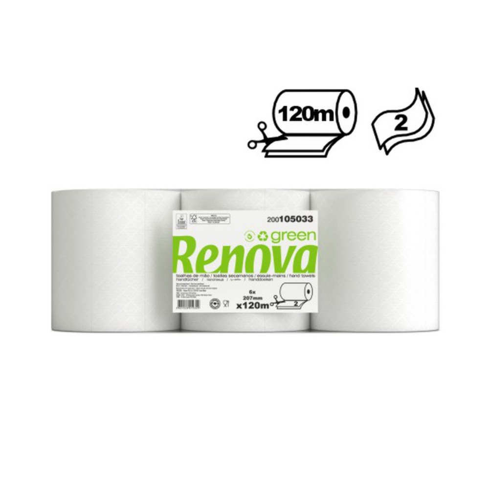 As toalhas de mão de corte automático Renovagreen oferecem papel suave e altamente absorvente, pensado para dispensadores automáticos. A sua utilização reduz desperdício e aumenta a eficiência, enquanto a qualidade do papel garante toque agradável e secagem eficaz. Uma solução prática para casas de banho movimentadas, combinando conveniência, higiene e sustentabilidade.